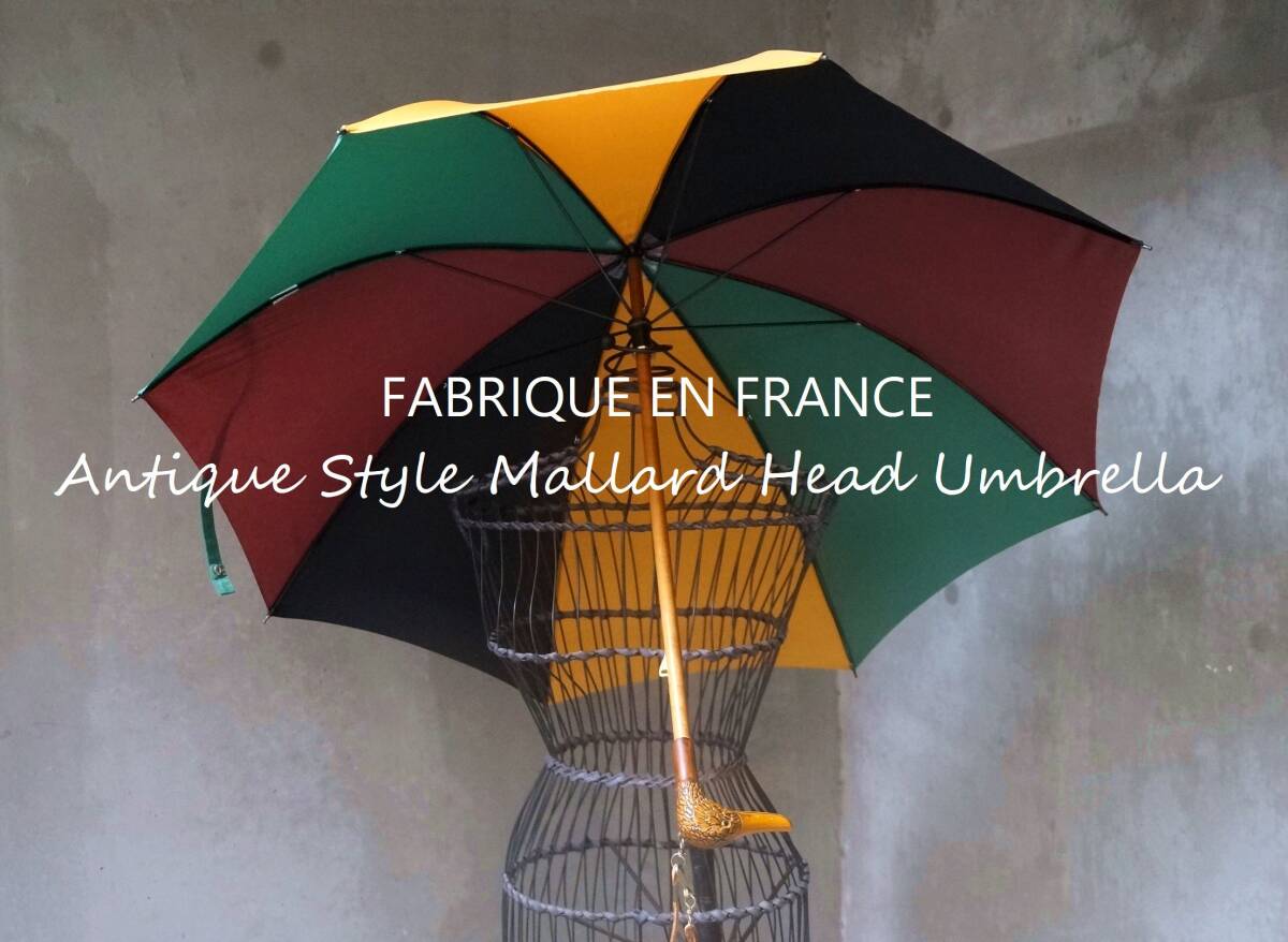 > フランス製生地 ハンドメイド木製マラードヘッド アヒルハンドル 4色八枚ハギ ショルダーストラップ付 アンティークスタイル アンブレラ 傘
