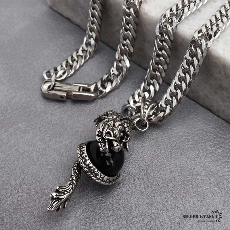 - (60cm) ステンレス ドラゴンネックレス シルバー ブラック ダブル喜平チェーンネックレス 幅6mm 龍 オニキス クロス