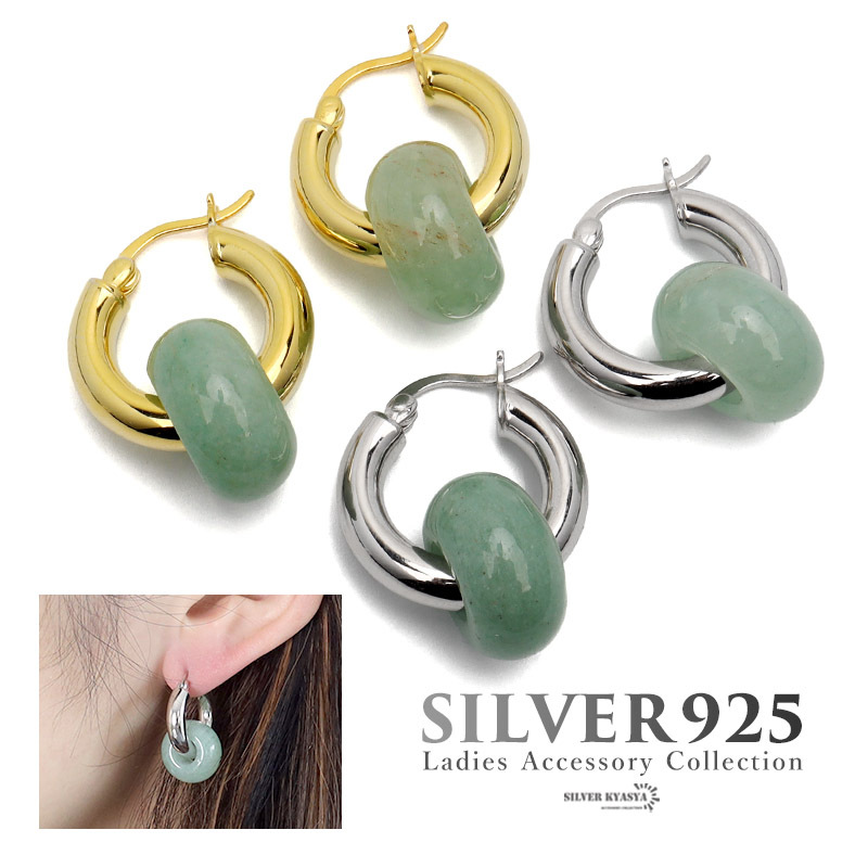 - (シルバー) ピアス フープピアス グリーン アベンチュリン シルバー925 18KGP ストーン ぷっくり 両耳用 2点セット