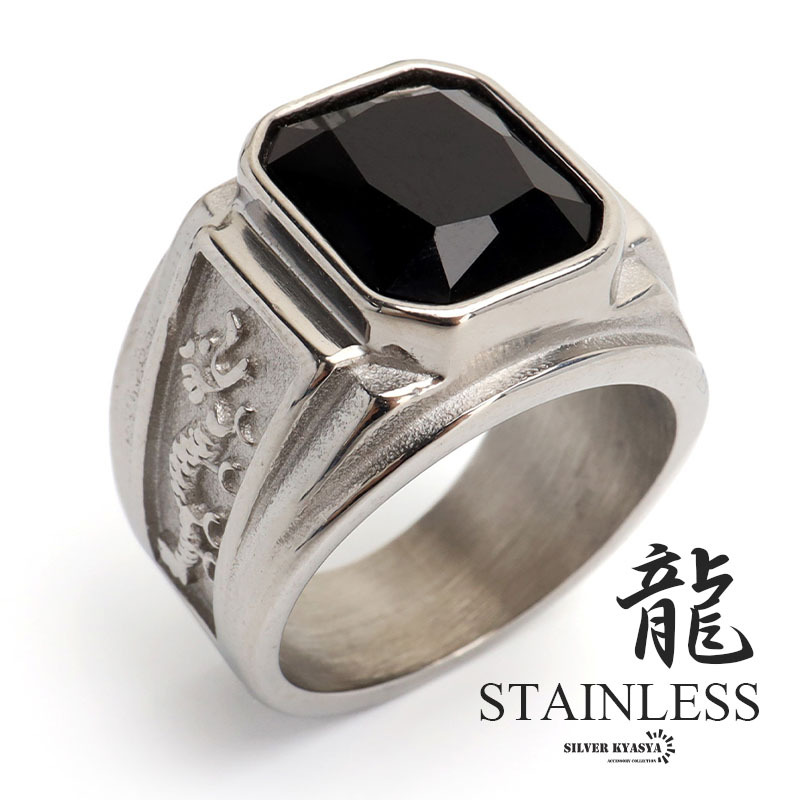 - (19号) ステンレス ドラゴンリング カレッジリング オニキスリング シルバー つや消し 印台リング メンズ 金属アレルギー対応