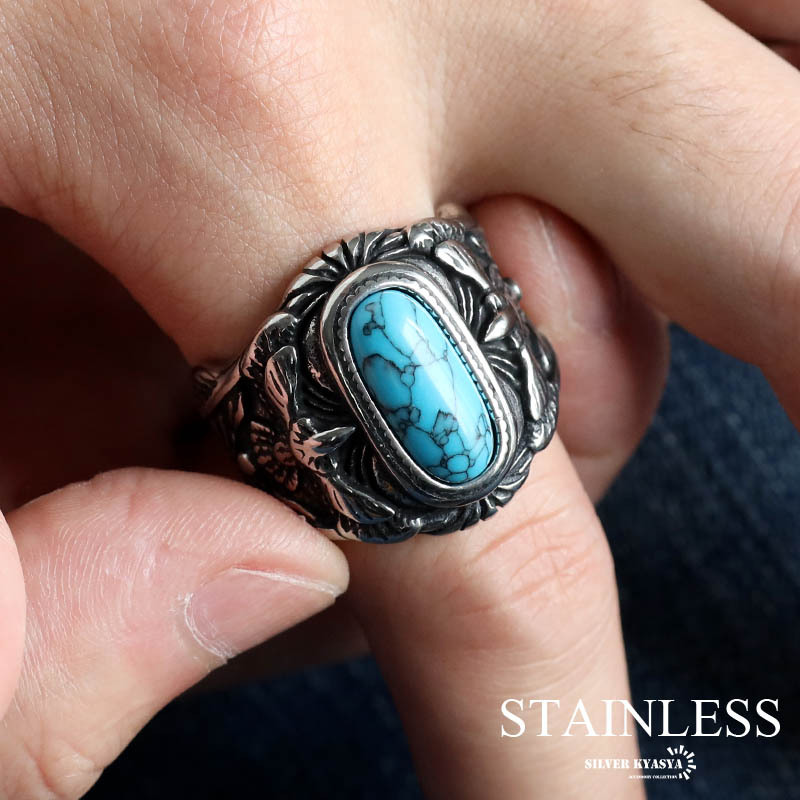 - (16号) ステンレス ターコイズリング ネイティブ インディアンジュエリー ごつめ 一粒リング 大粒ストーン 金属アレルギー対応