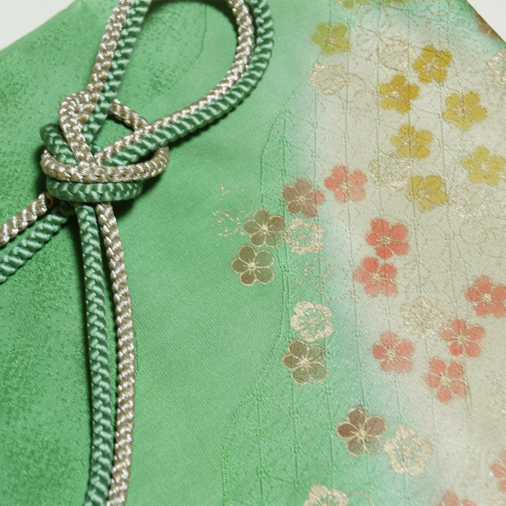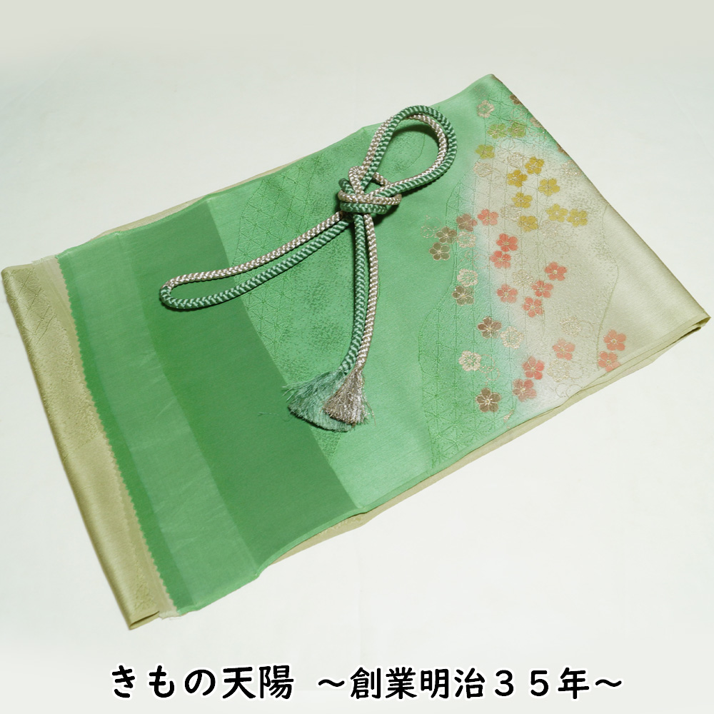 - 帯揚げ・帯締め 2点 セット フォーマル向き ぼかしに梅模様 薄緑色・山葵色系ぼかし 丸組 銀糸 リサイクル品 中古 正絹 リサイクル着物