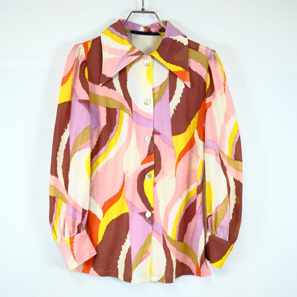 - 1970s ビンテージ 総柄デザイン アート ポリシャツ デカ襟 古着屋 花柄 長袖 ヒッピー