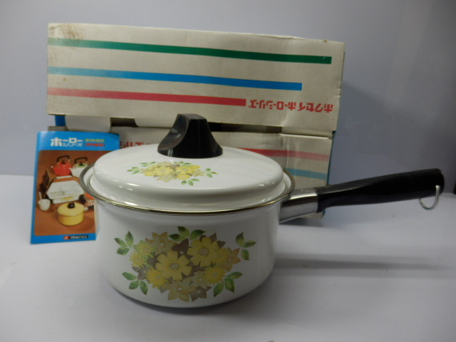 - r103(r68) 【片手鍋 18センチ】 ホクセイ ホーロー ダイヤフラワー イエロー ※難有(傷?塗料のはがれ・曇り汚れ多・箱ボロボロ)