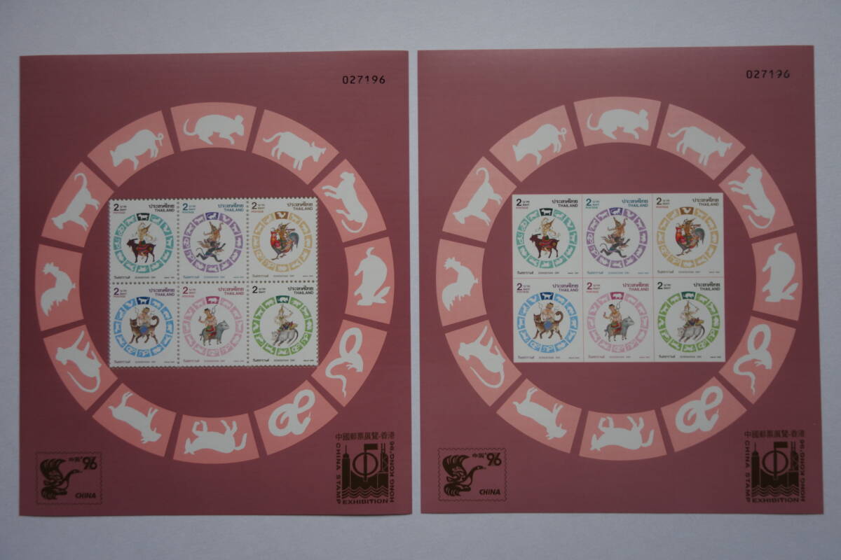 - 外国切手: タイ切手 「China '96・Hong Kong '96 切手展」(〈China '96〉などを加刷。)小型シート〔目打有と目打無〕2種 未使用