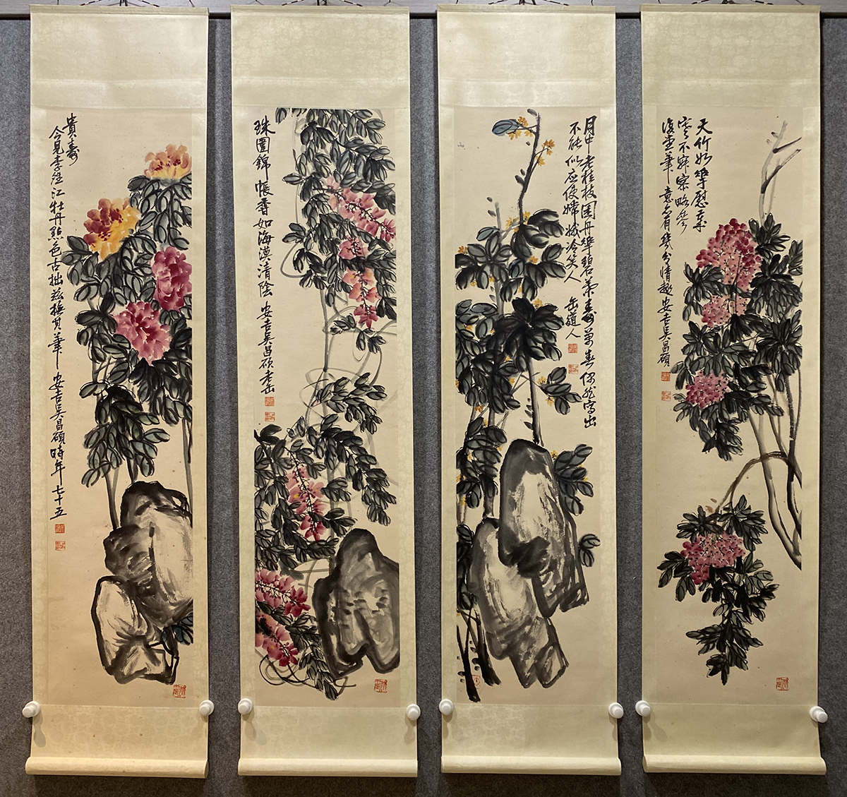 - 古美術 掛け軸 中国・近現代 「呉昌碩書」 紙本 【花卉図 四条屏】 立軸 書道 巻き物 肉筆保証 唐物 古画 画心136x 33cm LT-250256