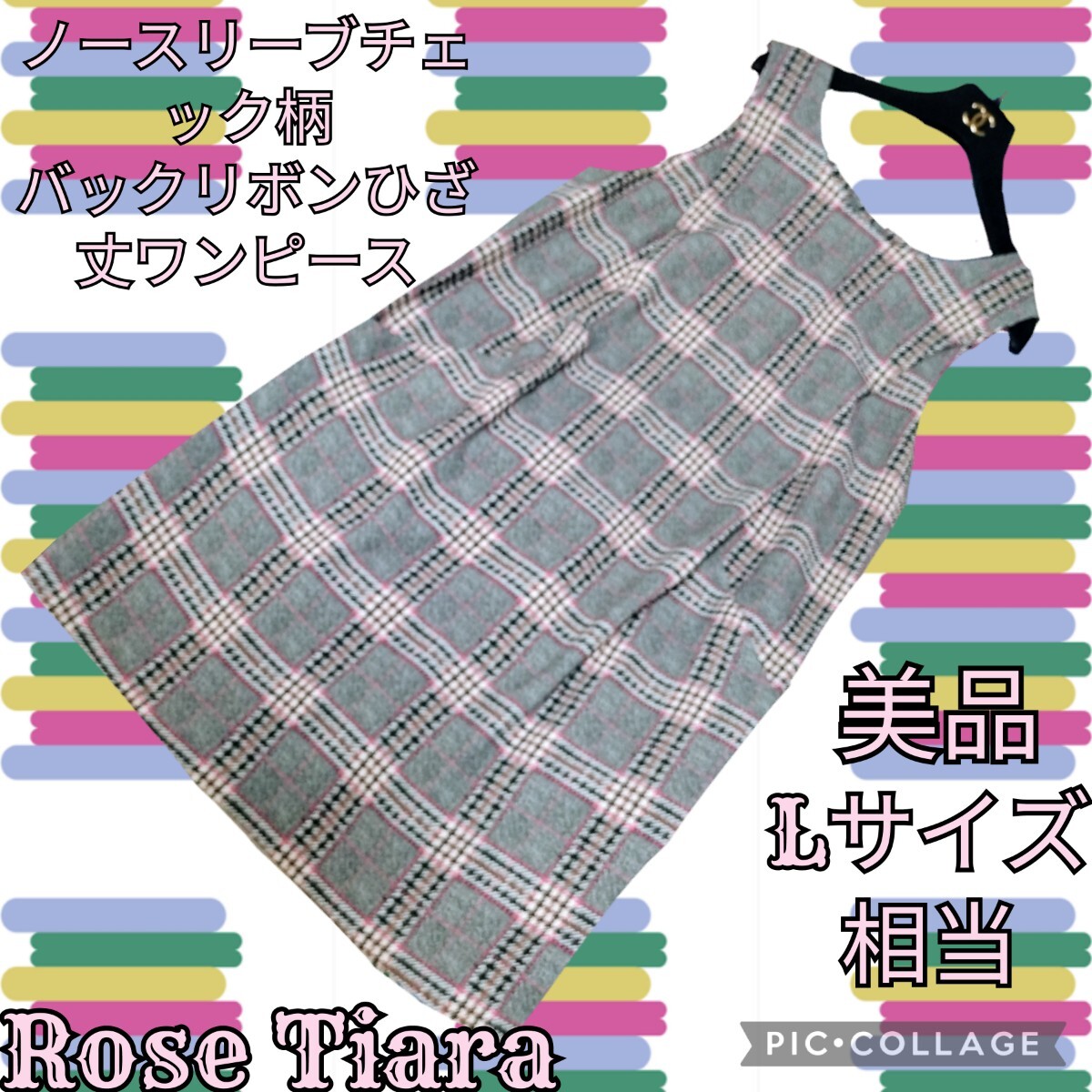 > 美品★ローズティアラ★チェック★ノースリーブワンピース★リボン★ひざ丈★グレー★Rose Tiara★大きめサイズ★フレア★春夏★42★総柄
