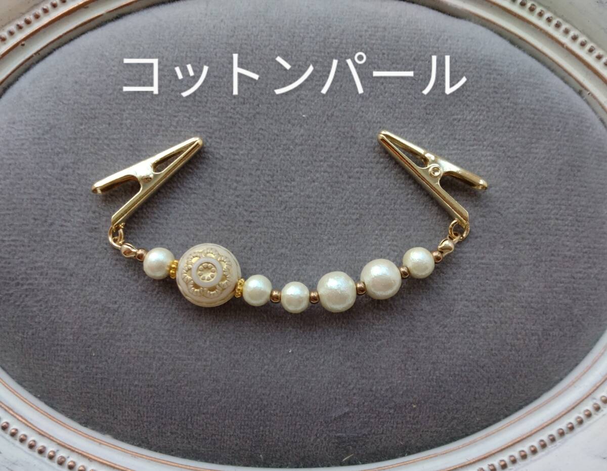 - ストールクリップ クリームカラーのコットンパールのショール留め ショールホルダー 羽織紐