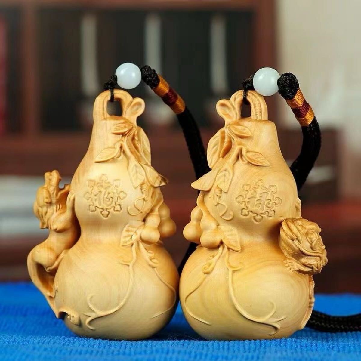 - 送料無料 高級木材 柘植木彫 根付 麒麟瓢箪 ナチュラル/天然木製/手作り/ハンドメイド/細工彫刻/ストラップ/プレゼント/開運風水厄除け