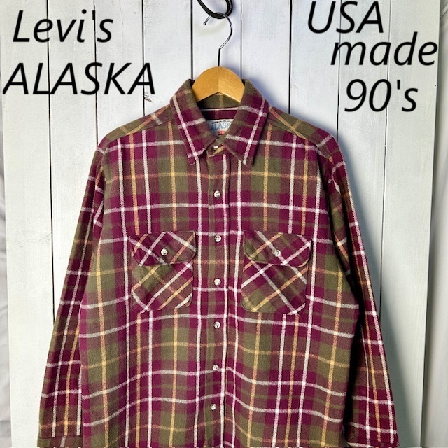 > sh●831 90s USA製 Levis ALASKA チェックヘビーネルシャツ L エンジ オールド ヴィンテージ リーバイス 米国製 アラスカ 厚手