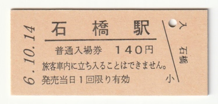 - 平成6年10月14日 東北本線 石橋駅 140円硬券普通入場券(日付印刷)