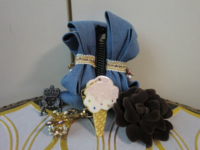> 最終値下げ★新品海外購入デニム生地ハートプレート&パールレースバナナクリップ&おまけお花クリップソフトクリームキーホルダー★切手★
