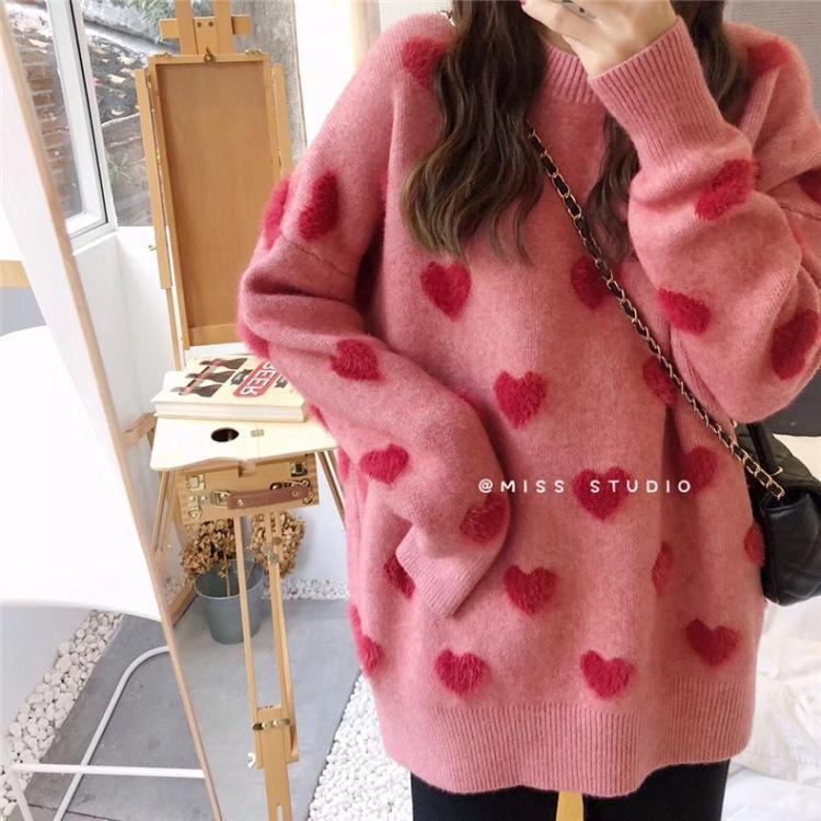 - 【ピンク★XL】ハート柄セーター長袖 秋冬暖かい 女性可愛い 人気
