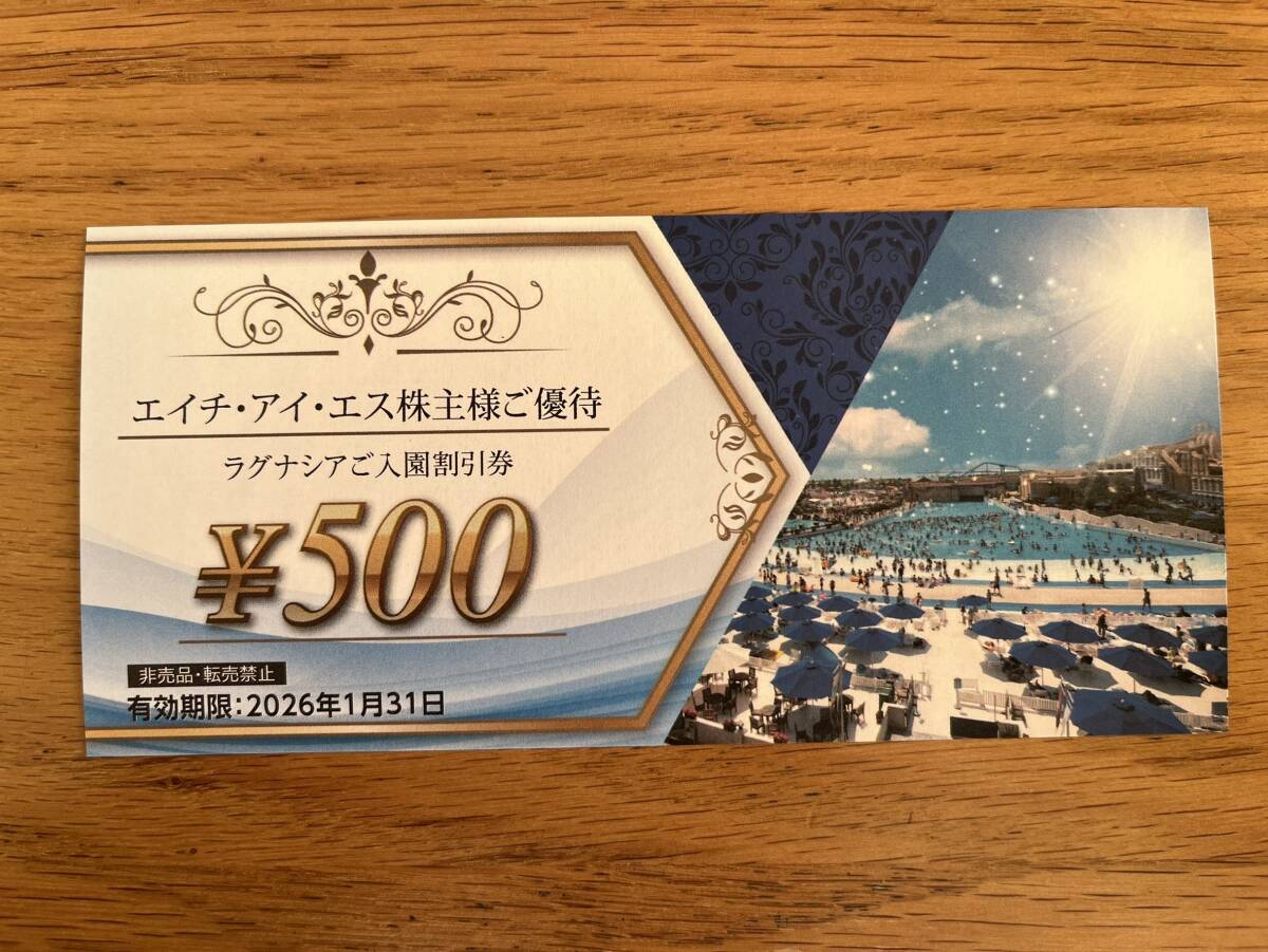 - ★即決!★ミニレターで送料無料!★有効期限 2026/1/31まで★HIS 株主優待券★ラグナシア 入場500円割引券★1枚