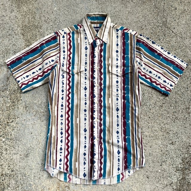 > 【S/M】USA製 Wrangler 半袖シャツ ネイティブ柄 ストライプ■ビンテージ オールド レトロ アメリカ古着 ラングラー 総柄 80s-90s