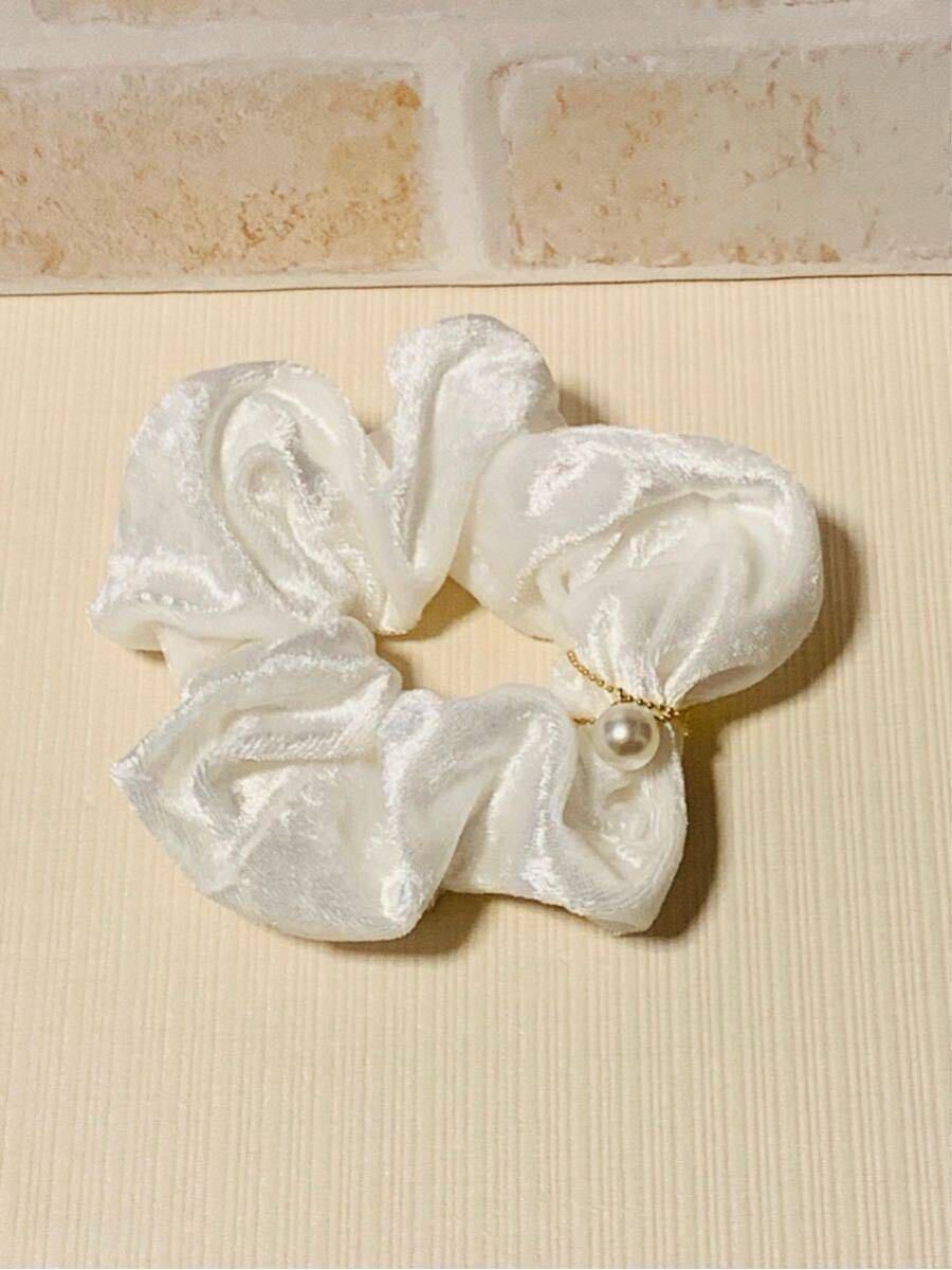- シュシュ(K-46)ベロア/ハンドメイド/ヘアアクセサリー/パール/白/ホワイト