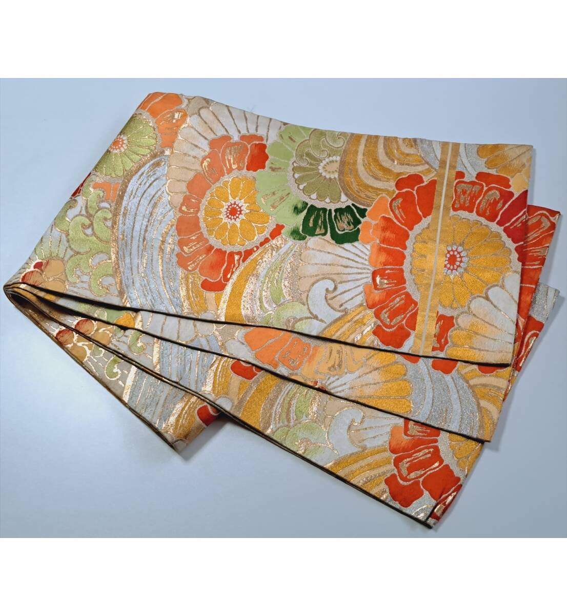 - ■着物の越田■幅32長さ387.5 アンティーク 正絹 丸帯 両面全通 金糸 菊 波 リメイク向け■は17J09