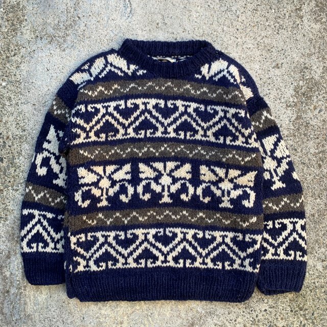 > 【L/XL】エクアドル製 REY WEAR ウールニット セーター 総柄 紺白■ビンテージ オールド レトロ アメリカ古着 ハンドニット