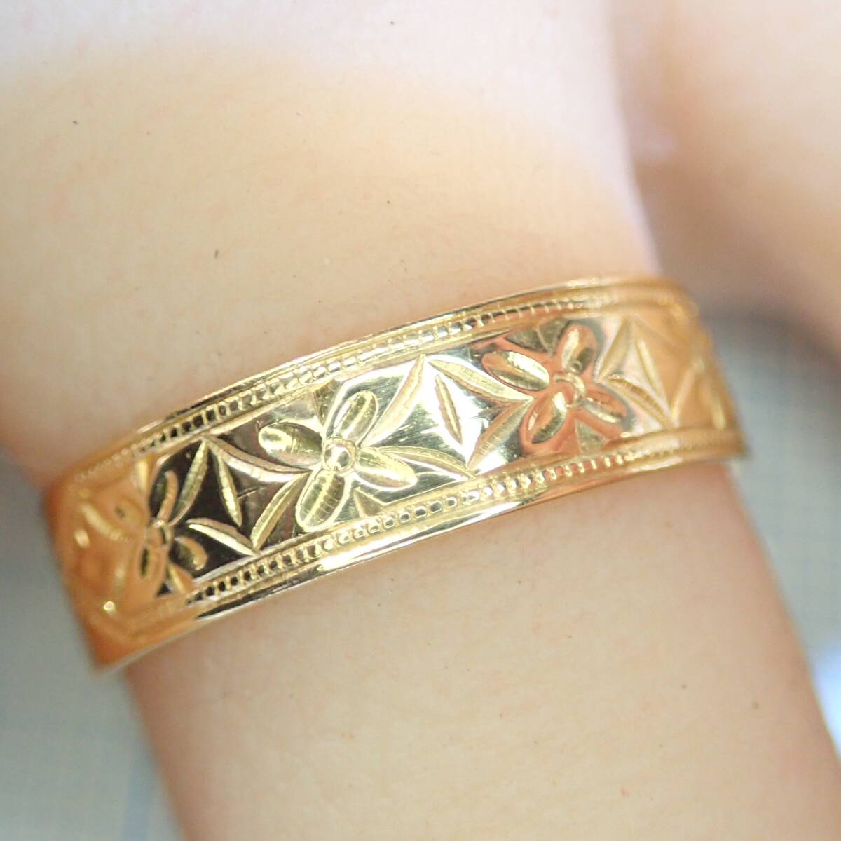 - ■K18 和彫り 平打ちリング 4.2g■花柄模様 ミル打ち 指輪■アンティーク 昭和レトロ■磨き仕上げ■美品中古■