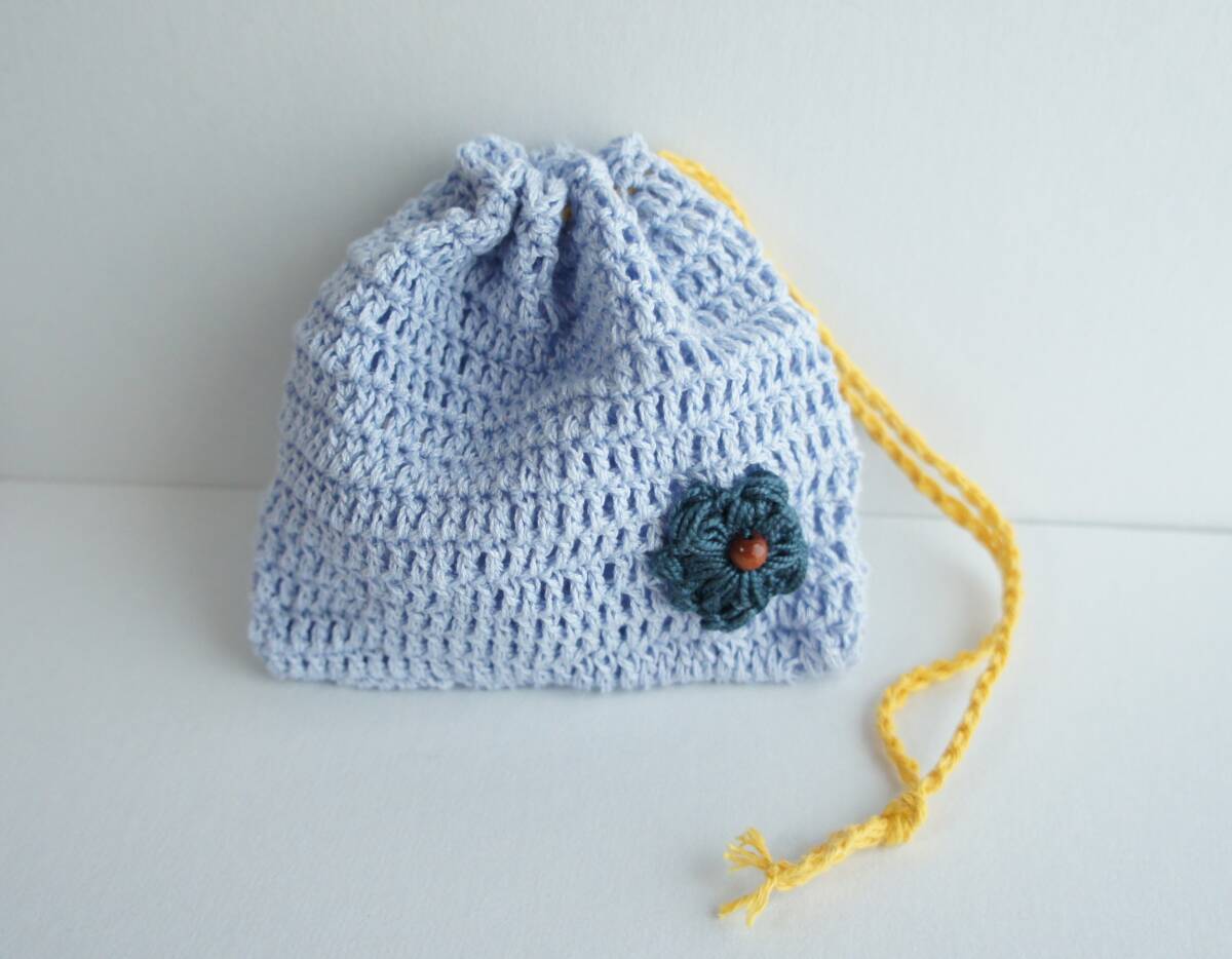- ♪ ハンドメイド レース糸 の 巾着 刺繍糸 の お花付き かぎ針編み 手編み ウッドビーズ