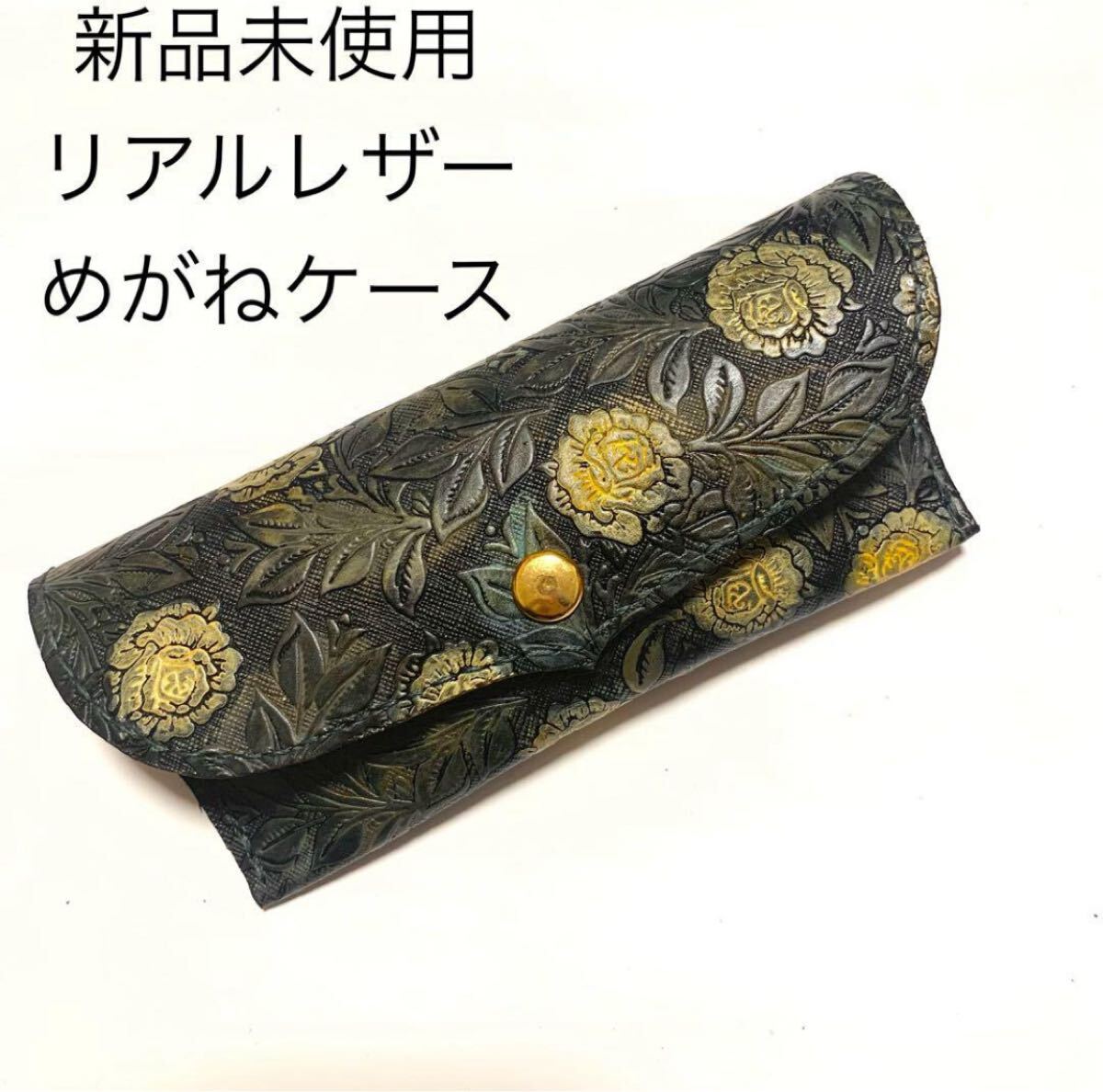 - 新品未使用 本革メガネケース かぶせ蓋 フラワー型押し レザー眼鏡入れ グリーン系 レザー小物 サングラスケース ギフト