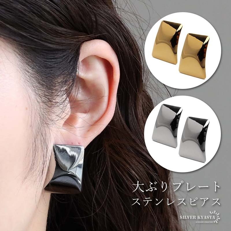 - (シルバー) ステンレス ワイドピアス プレートピアス メタルピアス 大ぶり スタッドピアス 両耳2点セット 女性 金アレ対応