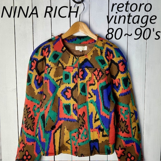 - レトロ 80s~ NINA RICH 短丈 カラフルジャガードニットブルゾン ジャケット 9 オールド ヴィンテージ ニナリッチ ショート丈 秋冬春 ●156