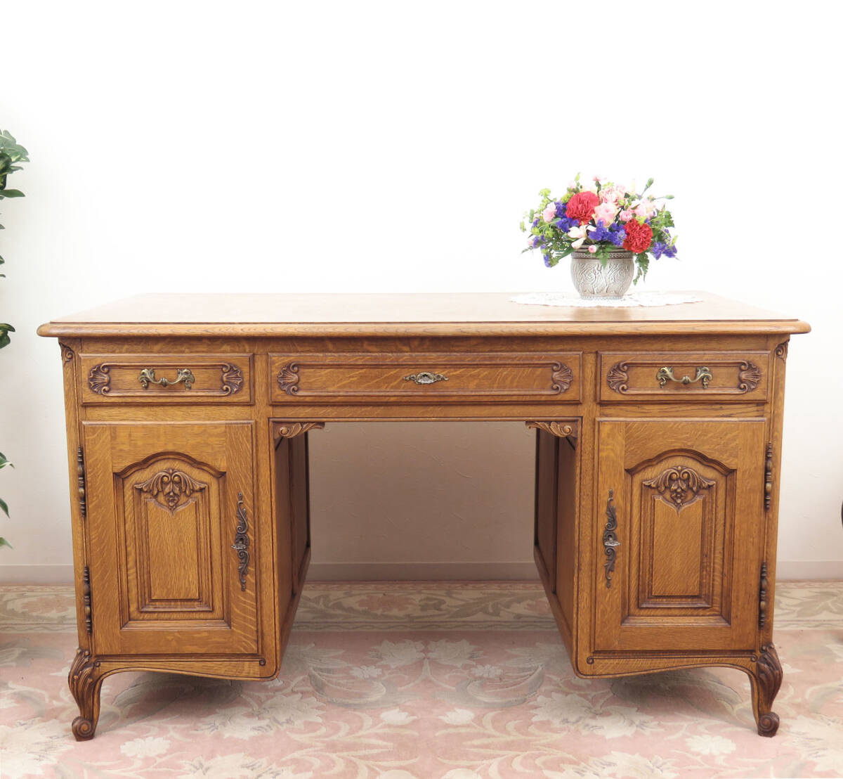- 寄木作りの天板が美しいエレガントなネコ(猫)脚の両袖デスク/木製机/店舗什器/ディスプレイ/インテリア/フランスのアンティーク家具/A-4486