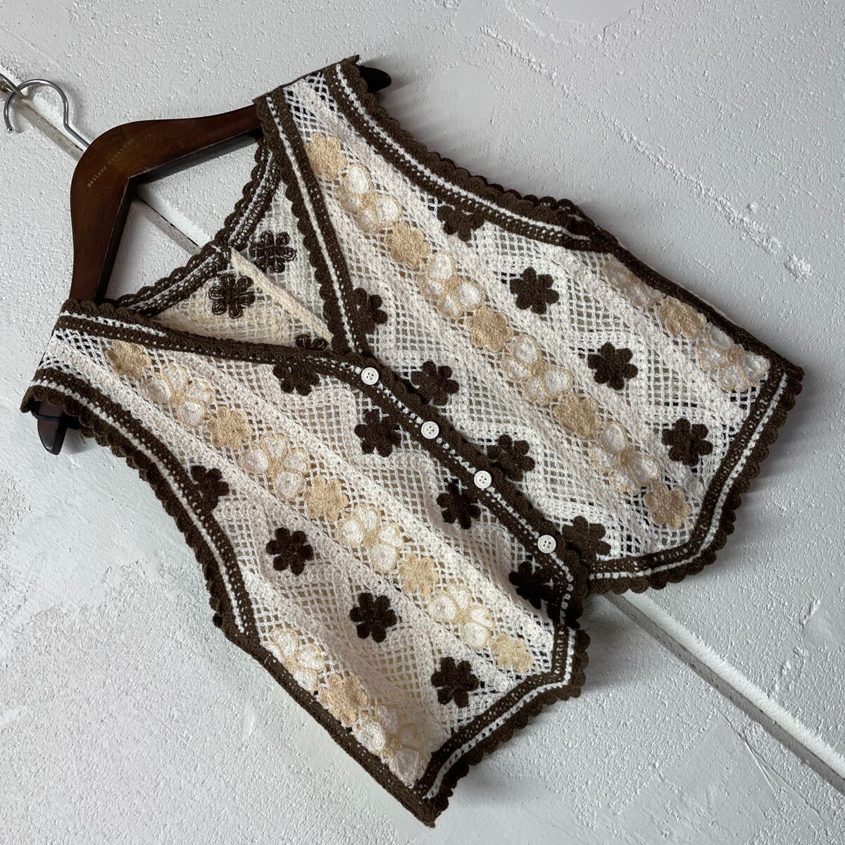 - 訳ありかぎ針花柄ショートベスト ベージュモカ