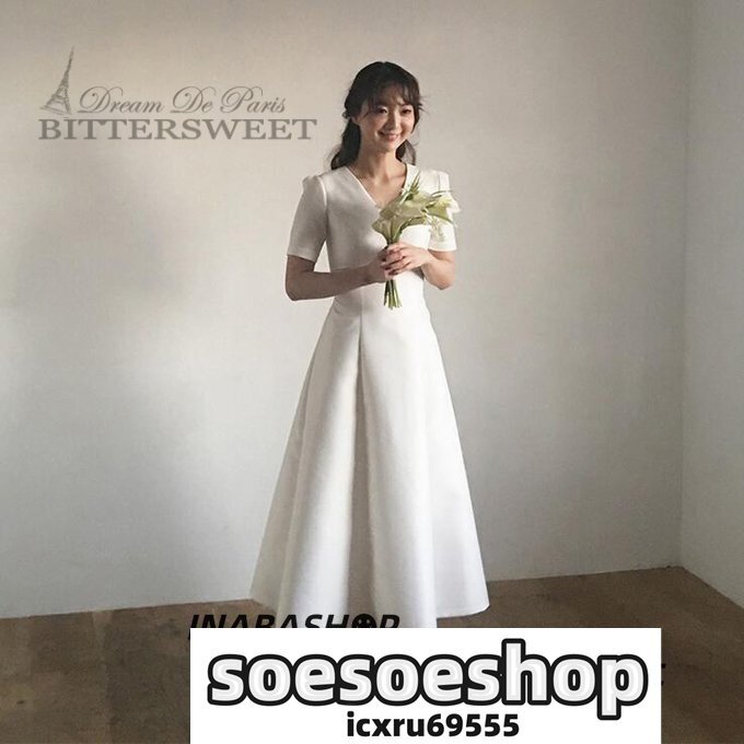 - ウェディングドレス ウエディングドレス ワンピース Aライン パフスリーブ ミモレ Vネック 披露宴 結婚式 演奏会 発表会 海外挙式ドレス