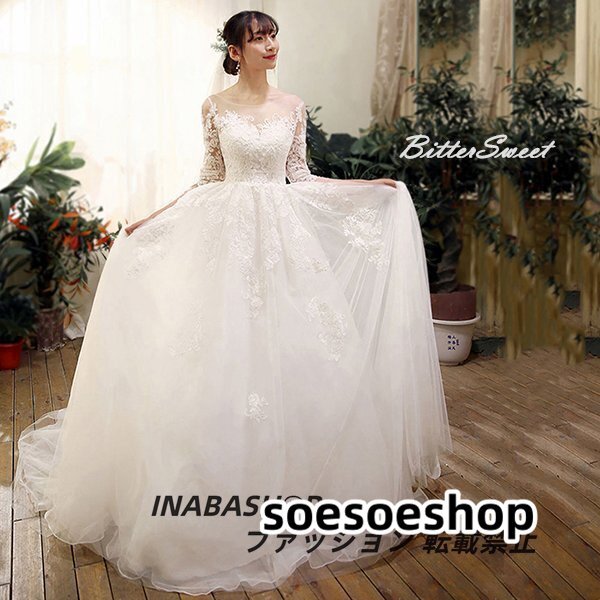 - ウェディングドレス ウエディングドレス 七分袖 袖あり Aライン花嫁 ドレス 白花嫁ドレスウエディング 二次会ウエデ 編み上げ レース・刺繍