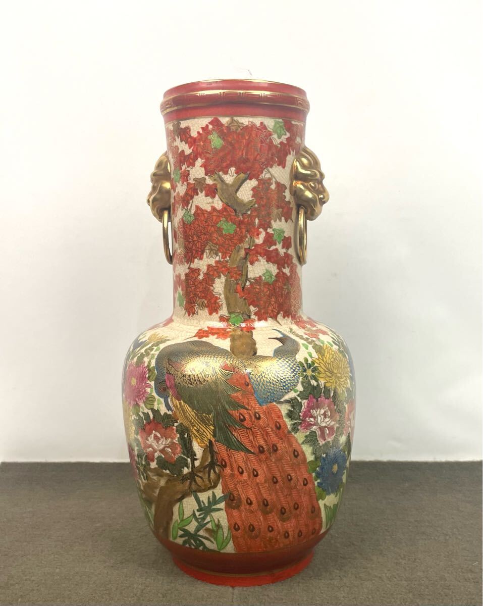 - ●豪華 薩摩焼 金襴手 花鳥文 耳付大花瓶 飾壷 丸十字薩摩在銘 高さ約46cm●
