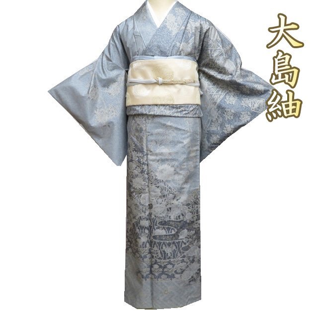 > 大島紬 着物 中古 正絹 袷 セミフォーマル 花模様 銀鼠色 墨色 金 身丈162.5cm 裄63.5cm M きもの北條 A1155-5