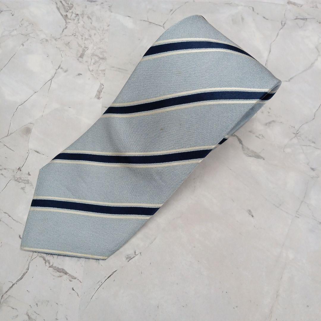 - 麻布テーラー ネクタイ 水色 紺 白 ストライプ シルク100%【n461】