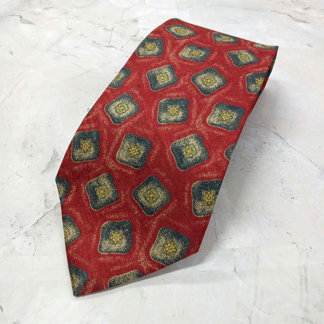 - エルメネジルドゼニア ネクタイ 総柄 タイル模様 赤系 シルク 正絹【n460】