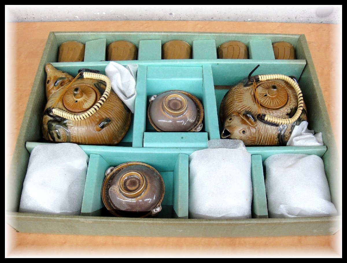 - 73101ST 未使用 信楽 分福茶釜 酒器セット ぶんぶく/たぬき/狸/タヌキ 酒燗器/急須/土瓶/チョカ 猪口/ちょこ/ぐい呑 丼/蓋付ミニ碗 昭和