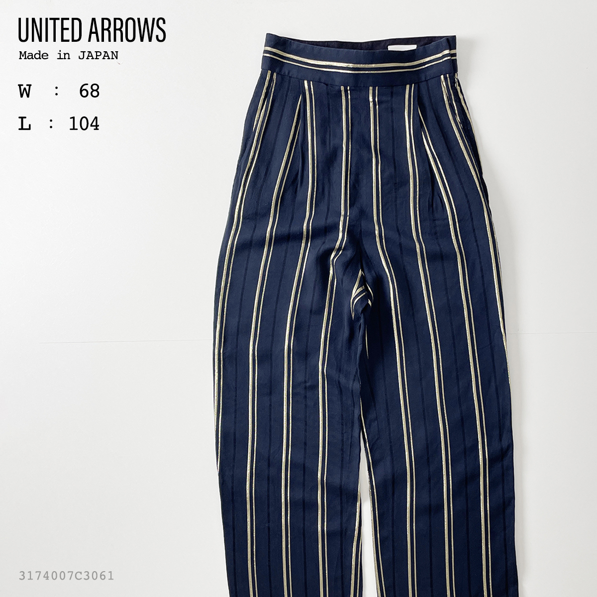> UNITED ARROWS ハイウエスト 薄手 ストライプ 柄 スラックス 総柄 ワイド パンツ 紺 ネイビー 春 夏 36 レディース S ユナイテッドアローズ