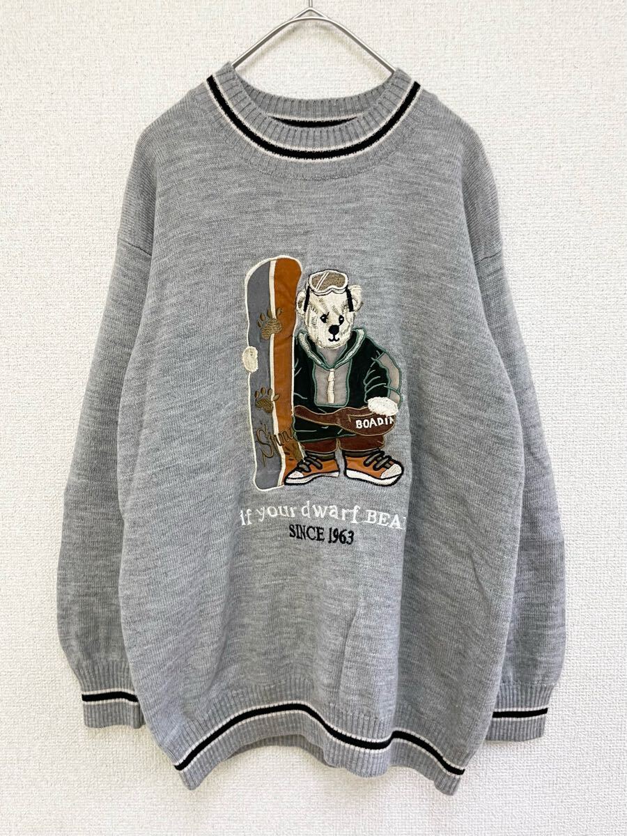 - 良品 PO・PO・LARE クルーネック ニット セーター 刺繍イラスト クマ メンズ Mサイズ相当 ウール100%