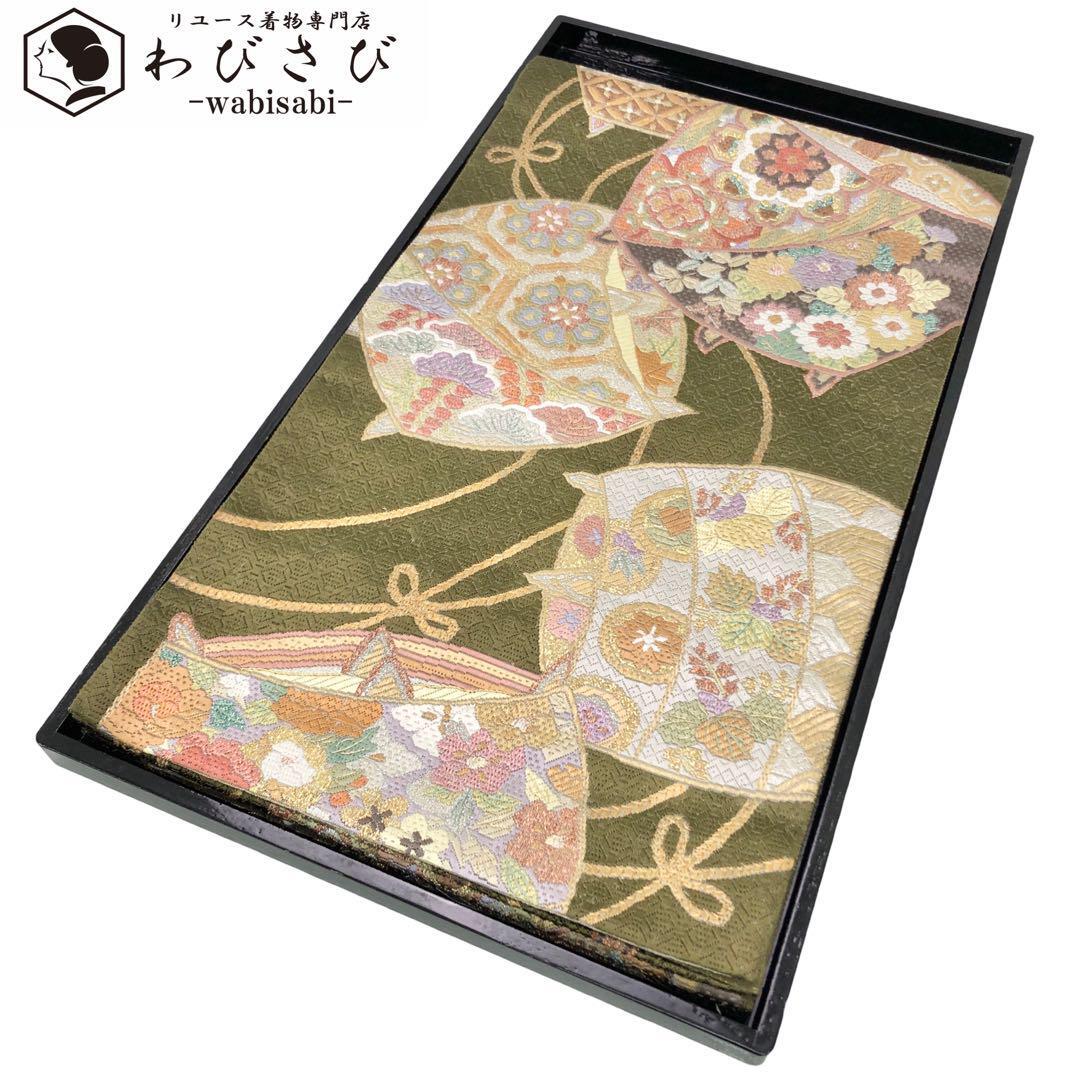 - 袋帯 糸枠に美しい花模様 華柄模様 金銀糸 橄欖色 O-4672 着物 きもの kimono 和服 和装 中古 リサイクル着物 【送料無料】