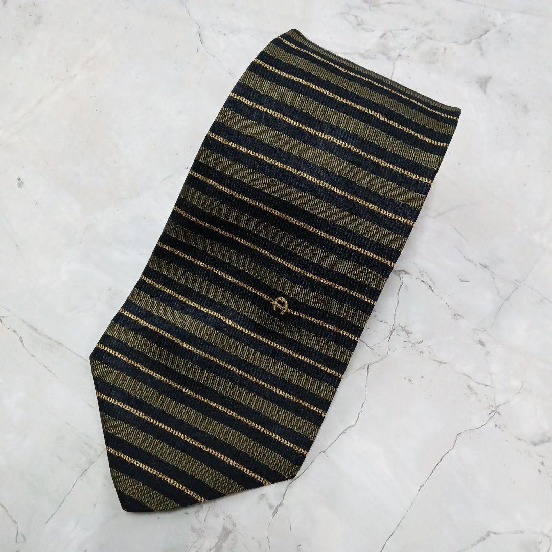 - アイグナー ネクタイ 緑 金 紺 ボーダー柄 シルク100%【n601】