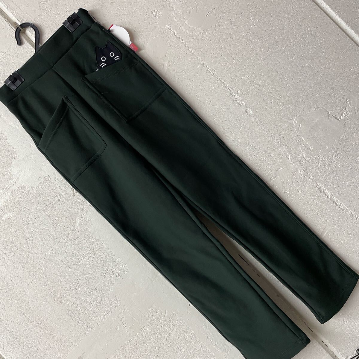 - 暖か裏起毛前ポケットねこアップリケパンツ カーキ色