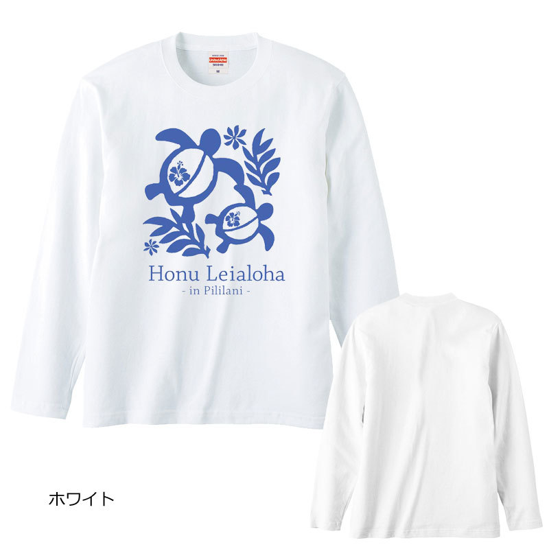 - レディースM対応(タグ表記男女兼用S)/ホワイト*ネイビーカラーホヌプリント*長袖/Tシャツ/フラダンス/ハワイ/送料無料【tl065】