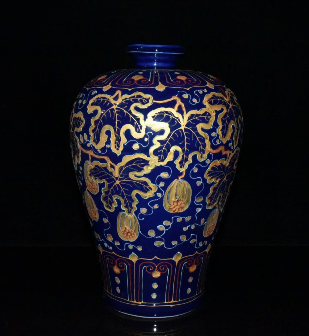- 【超珍館蔵】明 宣德年製款 古陶瓷品 霽藍 描金 瓜果紋 梅瓶 置物 古賞物 古美術品 稀少珍蔵品