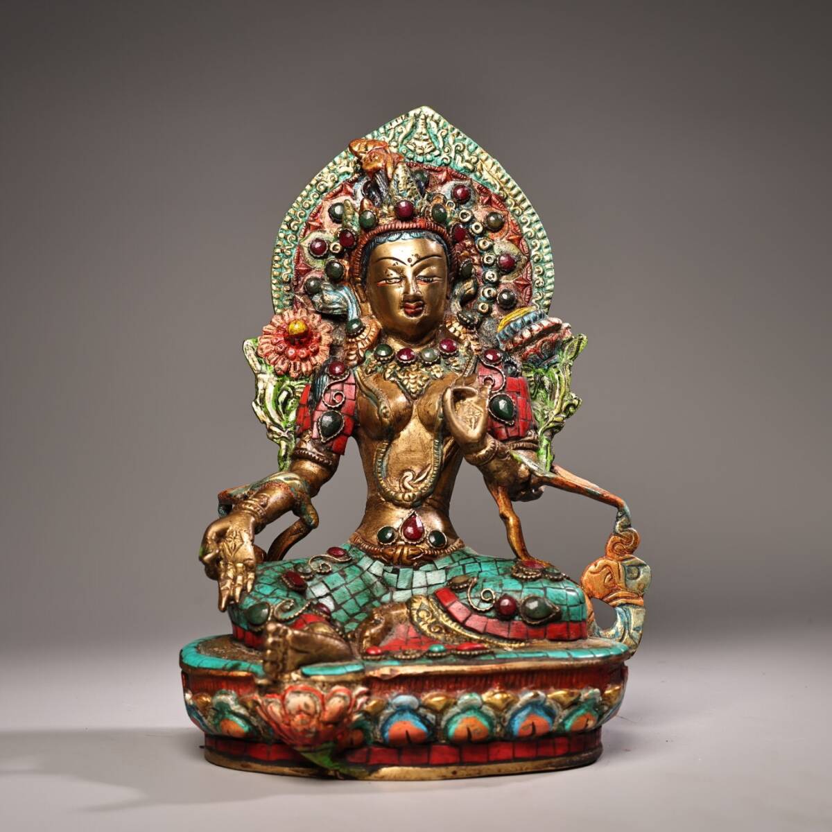 - 【超珍館蔵】銅製 寶石嵌 描金 彩繪 綠度母像 置物 古賞物 古美術品 稀少珍蔵品