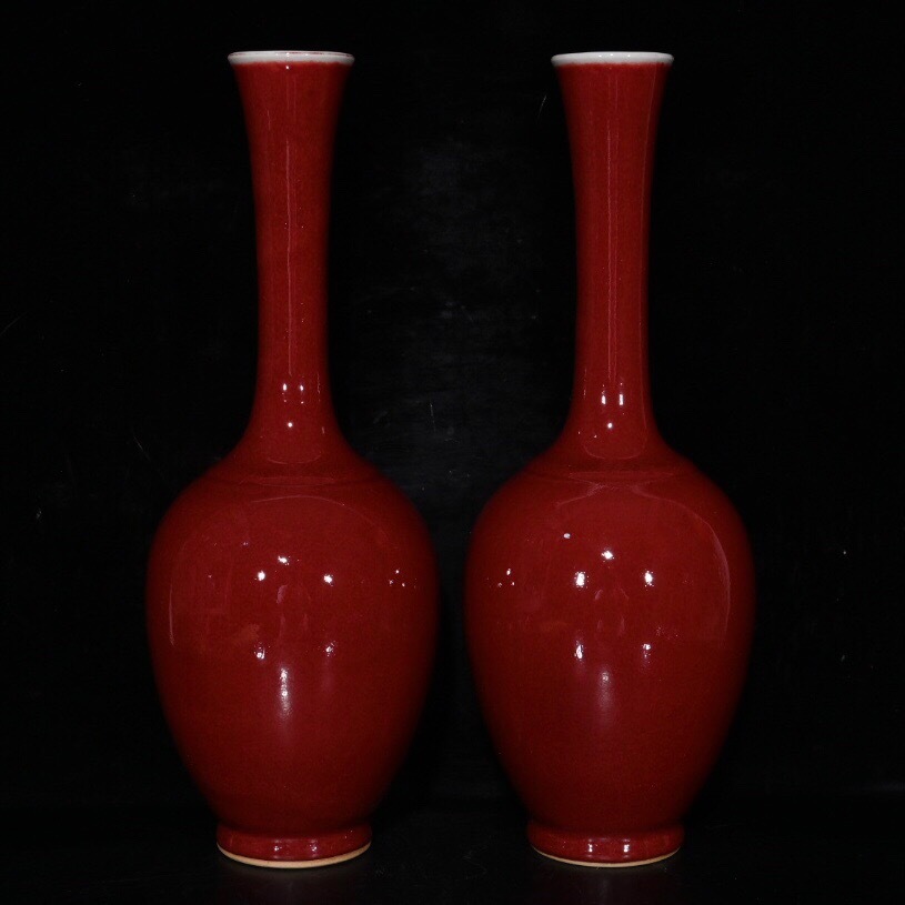 - ▽鴻▽ 清 康熙年製款 紅釉 開片 長頸瓶一對 古陶瓷品 置物 古賞物 中国古玩 中国古美術