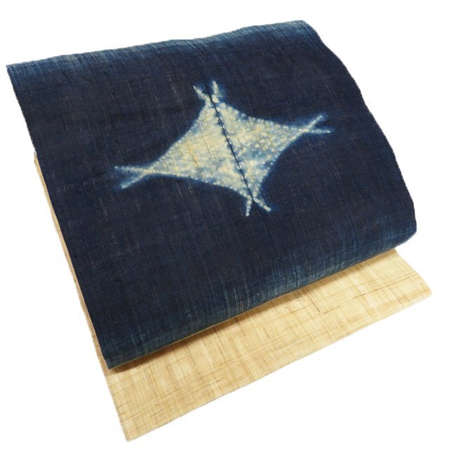 - 特選 夏物 開き名古屋帯 なごや帯 中古 リサイクル 麻 カジュアル 仕立て上がり 麦藁色 濃藍色 きもの北條 A1161-11