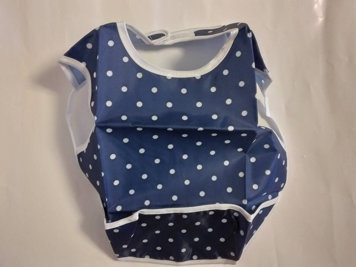 - 赤ちゃん用 ベビー用 エプロン スタイ よだれかけ ポリエステル 白の水玉模様 濃紺 ベネッセ こどもちゃれんじ