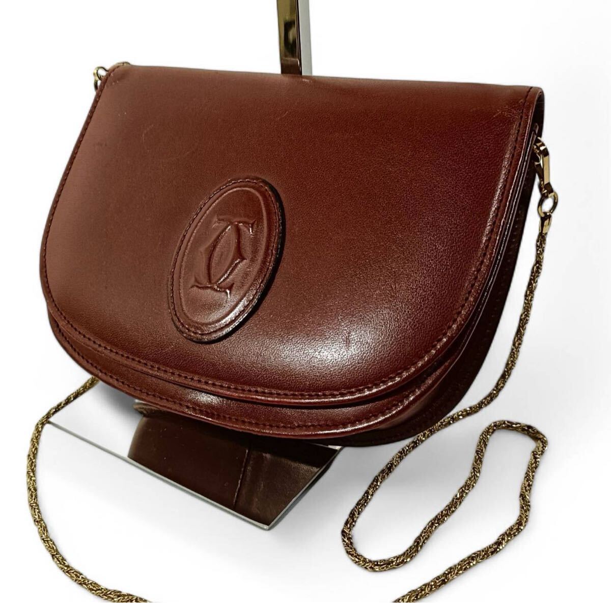 > 正規品 カルティエ ミニショルダーバッグ チェーン マストライン レザー 革 Cartier レザー ポシェット ボルドー 赤 チェーンショルダー