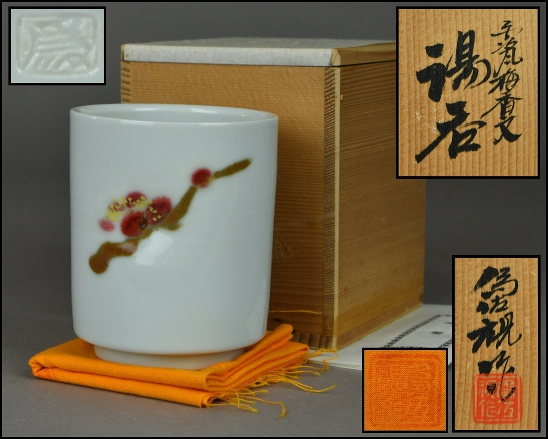- 京焼【松本為佐視】白磁 紅梅文 湯呑 共布 共箱 茶道具 DR25-0318