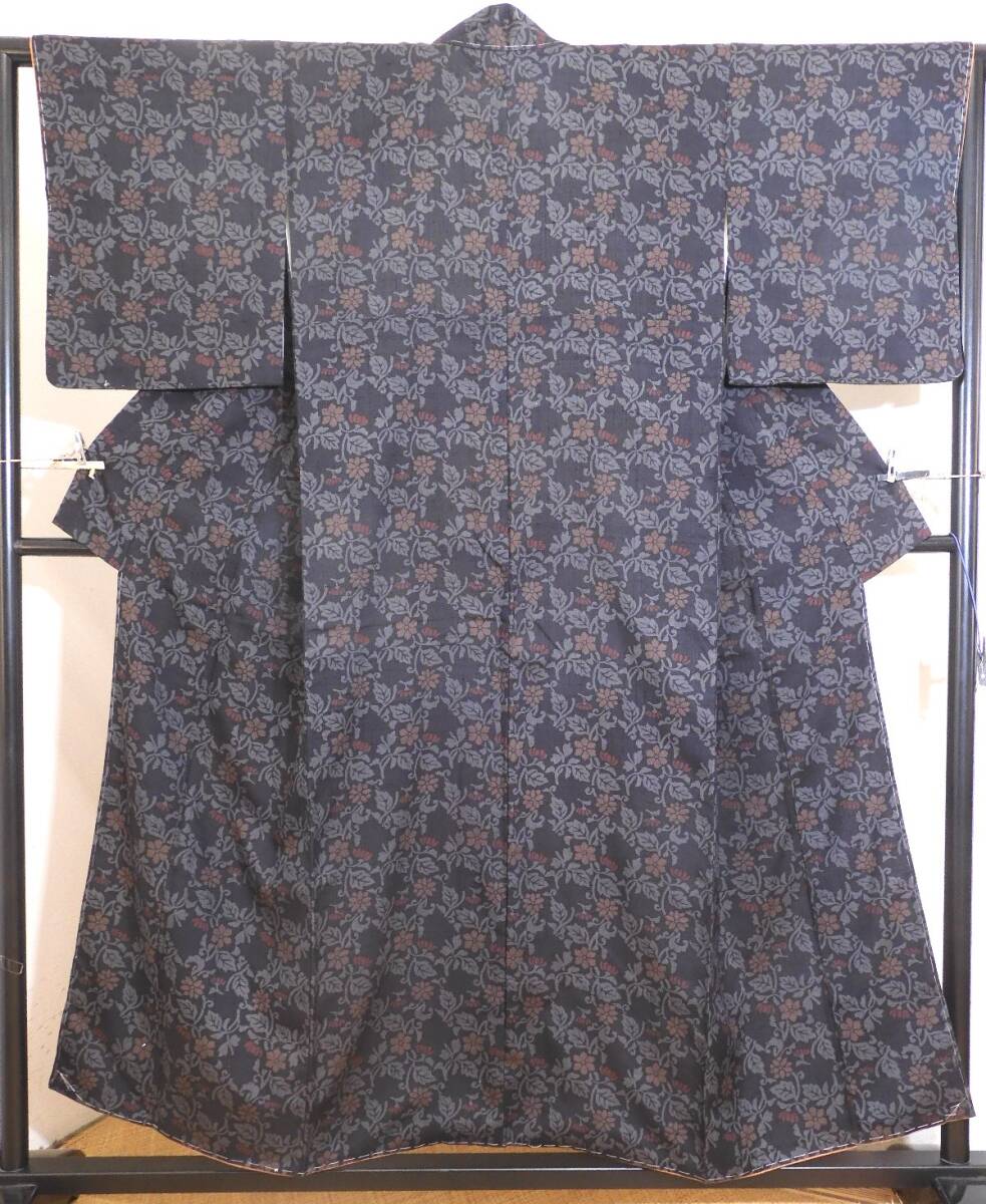 - <銀の斧>正絹・手織紬地に型染袷着物・小柄の方用・濃いグレー・しつけ付き